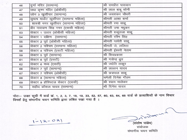 रायपुर : नगरीय निकाय चुनाव के लिए भाजपा ने बुधवार आधी रात के बाद भिलाई नगर निगम के लिए 57 उम्मीदवारों की पहली सूची जारी कर दी। 70 सीटों वाले भिलाई नगर निगम के शेष 13 वार्डों में नाम तय करने के लिए संभागीय चयन समिति गुरुवार को भी मंथन करेगी। नगरीय निकाय चुनाव की अधिसूचना 27 नवंबर से जारी है। नामांकन की प्रक्रिया शुरू हो जाने के बाद प्रदेश के दोनों प्रमुख राजनीतिक दलों ने प्रत्याशियों पर मंथन शुरू किया। भाजपा ने नगर निगमों के लिए संभाग स्तर पर और नगर पालिका और नगर पंचायत चुनाव के लिए जिला स्तर पर चयन समिति बनाई है। स्थानीय नेताओं को ही उसमें शामिल भी किया गया है। भाजपा की संभागीय चुनाव समिति पिछले तीन दिनों से विभिन्न नामों पर मंथन कर रही है। भिलाई नगर निगम के लिए मंगलवार को भी आधी रात के बाद तक बैठक चलती रही। बुधवार को भी आधी रात तक चर्चा के बाद केवल 57 नामों पर सहमति बन पाई। शेष 13 वार्डों में प्रत्याशियों के चयन के लिए गुरुवार को फिर बैठक होगी। उसके बाद नामों की दूसरी सूची जारी होगी।