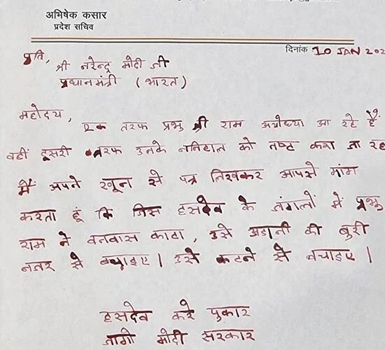 इसके साथ ही उन्होंने मुख्यमंत्री को लिखे पत्र में कहा कि आपको आदिवासी मुख्यमंत्री बनाकर बीजेपी ने पेश किया है। आप जल जंगल जमीन की रक्षा करें सीएम विष्णुदेव साय। अगर आदिवासियों का घर छीन जाएगा, तो आदिवासी कहां रहेंगे, कैसे जियेंगे। उन्होंने खून के खत में आगे लिखा कि आप खुद आदिवासी समुदाय से आते हैं आपको तो अच्छे से पता होगा। हम अपने लहू से पत्र लिखकर मांग करते हैं। फर्जी ग्रामसभा की जांच कराइए और आदिवासियों को न्याय दिलाइए। राज्य को अडानीगढ़ बनने से बचना होगा।
