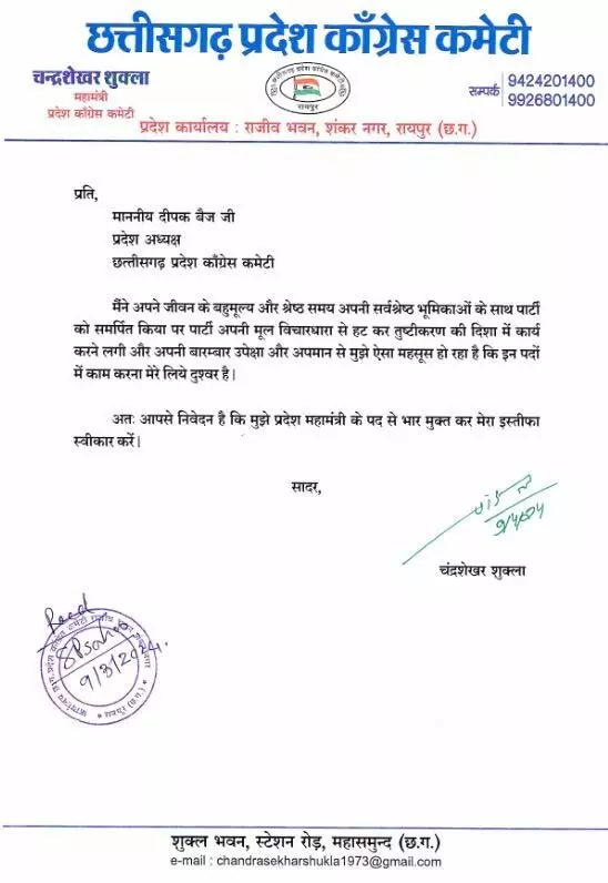 चंद्रशेखर शुक्ला ने आगे लिखा कि अपनी बारम्बार उपेक्षा और अपमान से मुझे ऐसा महसूस हो रहा है कि इन पदों में काम करना मेरे लिए दुश्वार है. निवेदन है कि मुझे प्रदेश महामंत्री के पद से भार मुक्त कर मेरा इस्तीफा स्वीकार करें.
