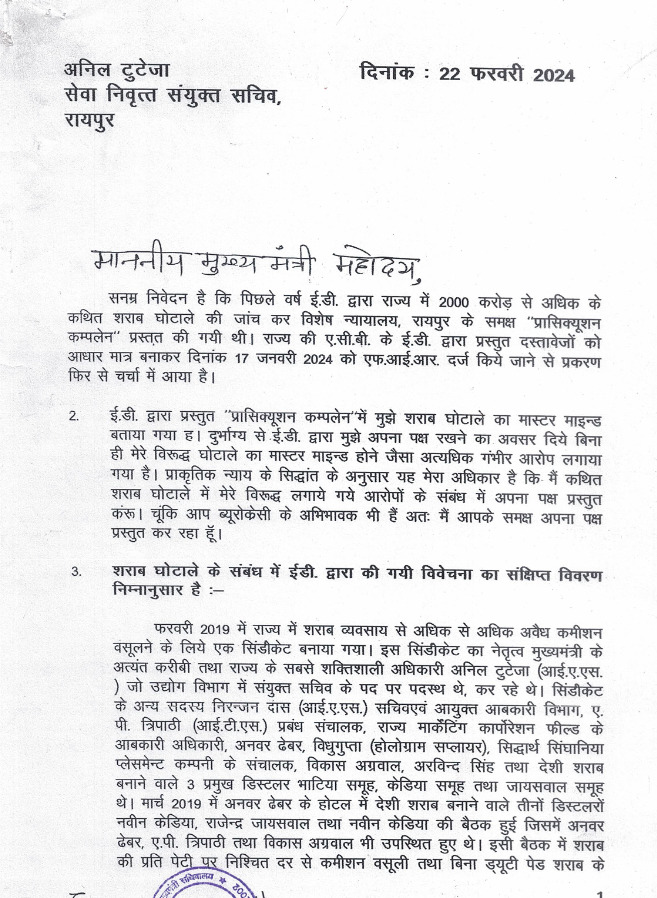 रायपुर : शराब घोटाले में गिरफ्तार रिटायर IAS अनिल टुटेजा ने मुख्यमंत्री विष्णुदेव साय को पत्र लिखा है। अपने पत्र में खुद को निर्दोष बताते हुए अनिल टुटेजा ने खुद पर लगाये ED के आरोपों को निराधार बताया है। उन्होंने पत्रा में कहा है कि ईडी ने उन्हें शराब घोटाले का मास्टर माइंड कहा है। ईडी ने उन्हें बिना अपना पक्ष रखे दिये ही घोटाले का मास्टर माइंड कहा है, जो न्याय के सिद्धांत के खिलाफ है।