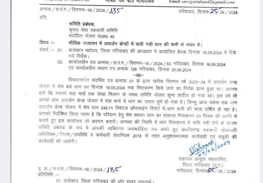 राजिम :- धान खरीदी केंद्र में धान गायब, नोटिस जारी।