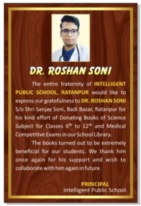 रतनपुर,, आदिकाल से ही दान देने की प्रथा चली आ रही है जिसमें धन-दौलत, जमीन- जायदाद, गौ दान, इत्यादि प्रकार की दान कर लोग पुण्य कमाने का काम करते हैं लेकिन आज डॉक्टर रोशन सोनी पिता श्री संजय कुमार सोनी के द्वारा इंटेलिजेंट पब्लिक स्कूल के कक्षा छठवीं से लेकर 12वी तक की छात्र-छात्राओं के लिए विज्ञान विषय की पुस्तकें स्कूल प्रबंधन को दान में दी गई है साथ ही मेडिकल परीक्षा हेतु अनेक उपयोगी पुस्तकों का भी दान इनके द्वारा किया गया है डॉ रोशन सोनी का मानना है कि विद्यादान महादान और जरूरतमंद विद्यार्थियों की मदद करना उनकी शिक्षा एवं ज्ञान अर्जन में सहायक बनना पुण्य कर्म है इन्हीं विचारों को आत्मसात करते हुए इन्होंने पुस्तक दान किया है