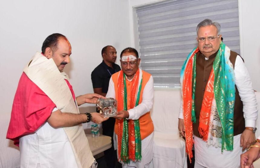 राजनांदगांव : मुख्यमंत्री विष्णु देव साय ने आज राजनांदगांव के क्लब हाऊस सन सिटी में प्रसिद्ध कथावाचक पंडित प्रदीप मिश्रा से सौजन्य मुलाकात की। मुख्यमंत्री विष्णु देव साय एवं विधानसभा अध्यक्ष डॉ. रमन सिंह ने उन्हें शाल-श्रीफल प्रदान कर सम्मानित किया तथा स्मृति चिन्ह के रूप में बेलमेटल की नंदी की मूर्ति भेंट की। मुख्यमंत्री ने कहा कि पावन श्रावण मास चल रहा है, इस दौरान आपसे मुलाकात करने का मुझे सौभाग्य प्राप्त हुआ।