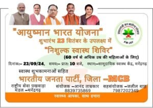 एम सी बी/ भारतीय जनता पार्टी के राष्ट्रीय नेतृत्व के आह्वान पर “राष्ट्रीय सेवा पखवाड़ा” के अंतर्गत एवं छत्तीसगढ़ प्रदेश नेतृत्व के निर्देशानुसार आयुष्मान भारत योजना के शुभारंभ दिवस 23 सितंबर के उपलक्ष्य में छत्तीसगढ़ के सभी विधानसभा में निशुल्क स्वास्थ्य शिविर का आयोजन किया जाएगा।