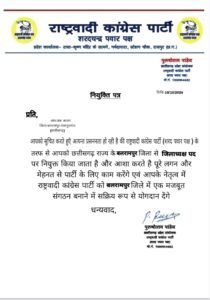 राष्ट्रवादी कांग्रेस पार्टी(शरदचंद्र पवार पक्ष) के बलरामपुर जिला अध्यक्ष बनाए गए- आफताब आलम