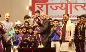 रायपुर। अबूझमाड़ के बच्चों ने राज्योत्सव में आज अपने मलखंभ का ऐसा शानदार प्रदर्शन किया कि कार्यक्रम देख रहे उपराष्ट्रपतिजगदीप धनखड़ ने पुनः मंच पर जाकर टीम के सबसे छोटे बच्चे को गोद में उठा लिया।