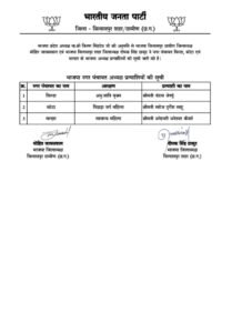 BREAKINGBJP CANDIDATE:नगर पंचायत बिल्हा, कोटा एवं मल्हार के अध्यक्ष प्रत्याशियों की भाजपा ने की घोषणा :- January 25, 2025Kamlesh LavahtreShare thisBJP CANDIDATE:नगर पंचायत बिल्हा, कोटा एवं मल्हार के अध्यक्ष प्रत्याशियों की भाजपा ने की घोषणा 👇 Share this:TwitterFacebookMoreWhatsAppRelatedShare this