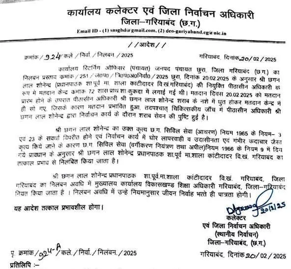 गरियाबंद। शराब एक ऐसी लत है, जो किसी को लग जाए तो फिर छूटती नहीं है. ऐसा ही कुछ मतदान केंद्र में तैनात पीठासीन अधिकारी के साथ हुआ, जो शराब के नशे में ही मतदान कराने लगे. इस संबंध में हुई शिकायत की जांच में पुष्टि होने के बाद जिला निर्वाचन अधिकारी ने तत्काल प्रभाव से पीठासीन अधिकारी को निलंबित कर दिया. कांटीदादर स्कूल में प्रधान पाठक छगन लाल सोनेंद्र त्रिस्तरीय पंचायत चुनाव के द्वितीय चरण में मतदान के दौरान छुरा ब्लॉक की कुकदा बूथ में बतौर पीठासीन अधिकारी तैनात थे. मतदाताओं ने शिकायत की कि अधिकारी शराब के नशे में धुत होकर मतदान को प्रभावित कर रहा है. इस पर पीठासीन अधिकारी की तत्काल मेडिकल जांच करवाई गई. जांच में शराब पीए जाने की पुष्टि होने के बाद आज जिला निर्वाचन अधिकारी दीपक अग्रवाल ने प्रधान पाठक को निलंबन का आदेश थमा दिया.