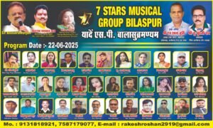 भारत के मशहूर गायक, एस. पी. बालासुब्रमण्यम, जिन्हें बालू के नाम से भी जाना जाता है, उनका जन्म तेलुगू परिवार में 4 जून को हुआ था, उनके पिता का नाम एसपी सांबामूर्ति था। उस दिन 7 स्टार म्यूजिकल ग्रुप के द्वारा उनके छायाचित्र पर पुष्प अर्पित कर श्रद्धांजलि दिए, एवं उन्हीं की स्मृति में रविवार 22 जून को संगीत का कार्यक्रम होटल एमेरल्ड पुराना बस स्टैंड पर सुबह 10:00 बजे से शाम 5:00 तक उनकी गए गीतों को प्रस्तुत करने छत्तीसगढ़ के हर जिले से गायक कलाकार आकर अपनी प्रस्तुति देंगे। कार्यक्रम में मुख्य अतिथि आंध्र समाज बिलासपुर के अध्यक्ष एन वी रमना मूर्ति उनके साथ विशिष्ट अतिथि आंध्र समाज के सचिव श्रीनिवास राव, यु मुरली राव, पार्षद एम श्रीनू, मनोरथ बाबू, संजीव पाल, छत्तीसगढ़ वॉच अखबार बिलासपुर ब्यूरो चीफ कमलेश लवहातरे एवं प्रखर पत्रकार महासंघ के प्रदेश अध्यक्ष विनय मिश्रा, गीत संगीत का आनंद लेने उपस्थित रहेंगे। सेवन स्टार म्यूजिकल ग्रुप के डायरेक्टर राकेश रोशन शाह ने हमारे संवाददाता को बताया कि एसपी बालासुब्रमण्यम एक प्रसिद्ध भारतीय पार्श्वगायक, अभिनेता, संगीत निर्देशक और फिल्म निर्माता थे।उन्होंने 16 भारतीय भाषाओं में 40,000 से अधिक गाने गाए और गिनीज वर्ल्ड रिकॉर्ड में अपना नाम दर्ज कराया है। 6 बार सर्वश्रेष्ठ पार्श्वगायक के लिए राष्ट्रीय फिल्म पुरस्कार जीता उन्हें की स्मृति में गीत संगीत का कार्यक्रम आयोजित है।