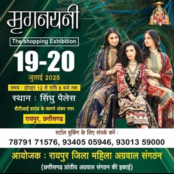 रायपुर। आगामी 19 और 20 जुलाई को सिंधु पैलेस, रायपुर में “मृगनयनी – सावन स्पेशल प्रदर्शनी” का भव्य आयोजन होने जा रहा है। इस दो दिवसीय कार्यक्रम का आयोजन रायपुर जिला महिला अग्रवाल संगठन (छत्तीसगढ़ प्रांतीय अग्रवाल संगठन की इकाई) द्वारा किया जा रहा है।
