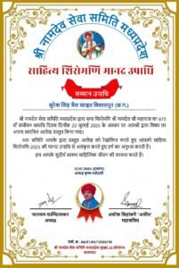 सुरेश सिंह बैस को श्री नामदेव सेवा समिति मध्य प्रदेश द्वारा “साहित्य शिरोमणि मानद उपाधि”