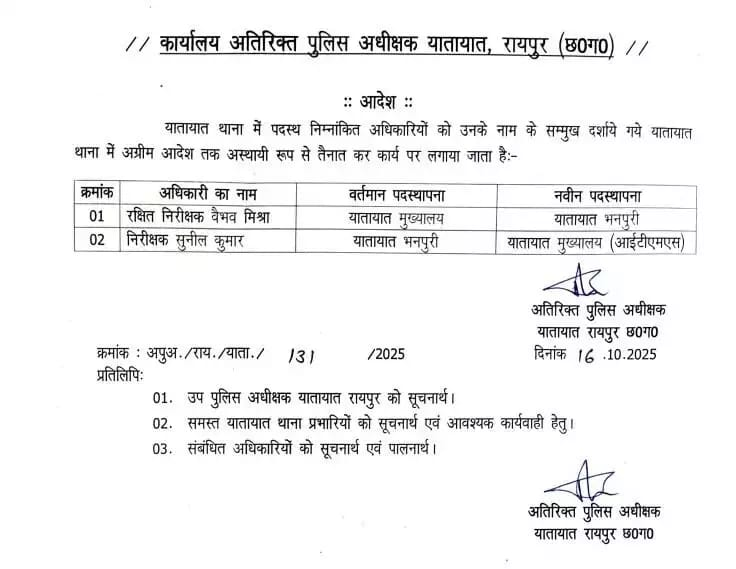 प्रांतीय वॉच रायपुर वॉचTransfer Breaking : यातायात थाना प्रभारियों का हुआ ट्रांसफर, आदेश जारी… October 16, 2025SUDHIR TIWARI Share thisरायपुर। 2 यातायात थाना प्रभारियों का ट्रांसफर किया गया है। जारी आदेश के अनुसार, वैभव मिश्रा को यातायात मुख्यालय से भनपुरी यातायात थाना प्रभारी बनाया गया है। वहीं सुनील कुमार को भनपुरी थाना यातायात से यातायात मुख्यालय भेजा गया है।देखें आदेश-Share this:TwitterFacebookMoreWhatsAppRelatedShare this