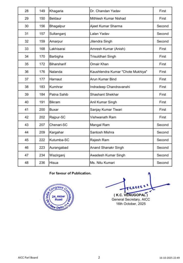 Bihar Elections : बिहार विधानसभा चुनाव 2025 के लिए कांग्रेस पार्टी ने अपने उम्मीदवारों की पहली सूची जारी कर दी है। इस सूची में कुल 48 उम्मीदवारों के नाम शामिल हैं। महागठबंधन में सीटों के बंटवारे पर अब तक कोई आधिकारिक घोषणा नहीं हुई है, लेकिन गठबंधन की पार्टियों ने अपने-अपने स्तर पर प्रत्याशियों को सिंबल देना शुरू कर दिया है।