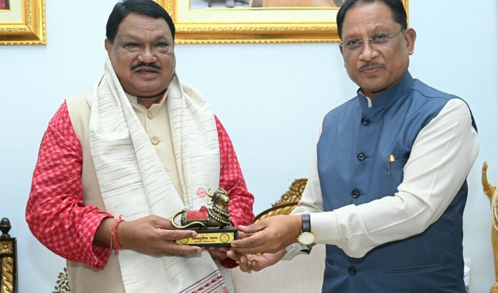 रायपुर। मुख्यमंत्री विष्णुदेव साय से मुख्यमंत्री निवास कार्यालय में केंद्रीय जनजातीय कार्य मंत्री जुएल ओराम ने सौजन्य मुलाकात की। मुख्यमंत्री साय ने जुएल ओराम का छत्तीसगढ़ में स्वागत करते हुए उन्हें बस्तर आर्ट का प्रतीक चिन्ह व शॉल भेंट किया।