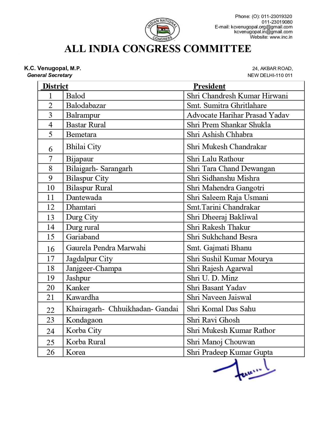 BREAKING : कांग्रेस जिलाध्यक्षों की सूची जारी