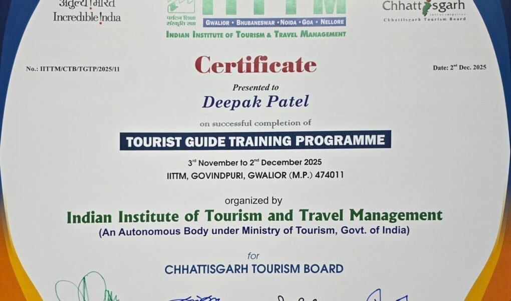 3 नवंबर से 2 दिसंबर 2025 तक चले इस एक माह के गाइड प्रशिक्षण कार्यक्रम में अधिकांश प्रशिक्षणार्थी बस्तर क्षेत्र से थे। इस प्रशिक्षण मे पर्यटक मार्गदर्शन, संप्रेषण कौशल, सांस्कृतिक धरोहर एवं पर्यटन प्रबंधन जैसे विषयों का गहन अध्ययन कराया गया। प्रशिक्षण के दौरान युवाओं को व्यावहारिक अनुभव भी दिए गए ताकि वे छत्तीसगढ़ की समृद्ध सांस्कृतिक विरासत, प्राकृतिक सौंदर्य और पर्यटन संभावनाओं को प्रभावी रूप से प्रदर्शित कर सकें।