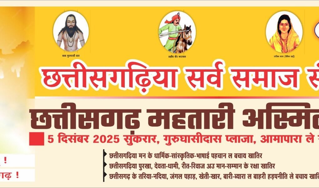 छत्तीसगढिया सर्व समाज द्वारा छत्तीसगढ महतारी के सम्मान, छत्तीसगढ की अस्मिता , पुरखो के सम्मान, छत्तीसगढ के जल जंगल जमीन के लूट के खिलाफ, छत्तीसगढी भाषा के अनादर व उपहास के विरोध मे राजधानी रायपुर मे 5 दिसंबर 2025 को आमापारा स्थित गुरू घासीदास प्लाजा से कलेक्टोरेट रायपुर तक छत्तीसगढ महतारी अस्मिता रैली का आयोजन किया गया है । जहां छत्तीसगढ महतारी की आरती पश्चात महामहिम राज्यपाल को ज्ञापन सौंपा जायेगा ।