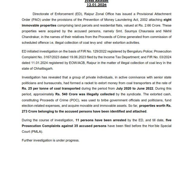 रायपुर। प्रवर्तन निदेशालय (ED), रायपुर जोनल कार्यालय ने प्रिवेंशन ऑफ मनी लॉन्ड्रिंग एक्ट (PMLA), 2002 के तहत बड़ी कार्रवाई करते हुए छत्तीसगढ़ में कोयला लेवी की अवैध वसूली मामले से जुड़ी संपत्तियों को अटैच किया है।